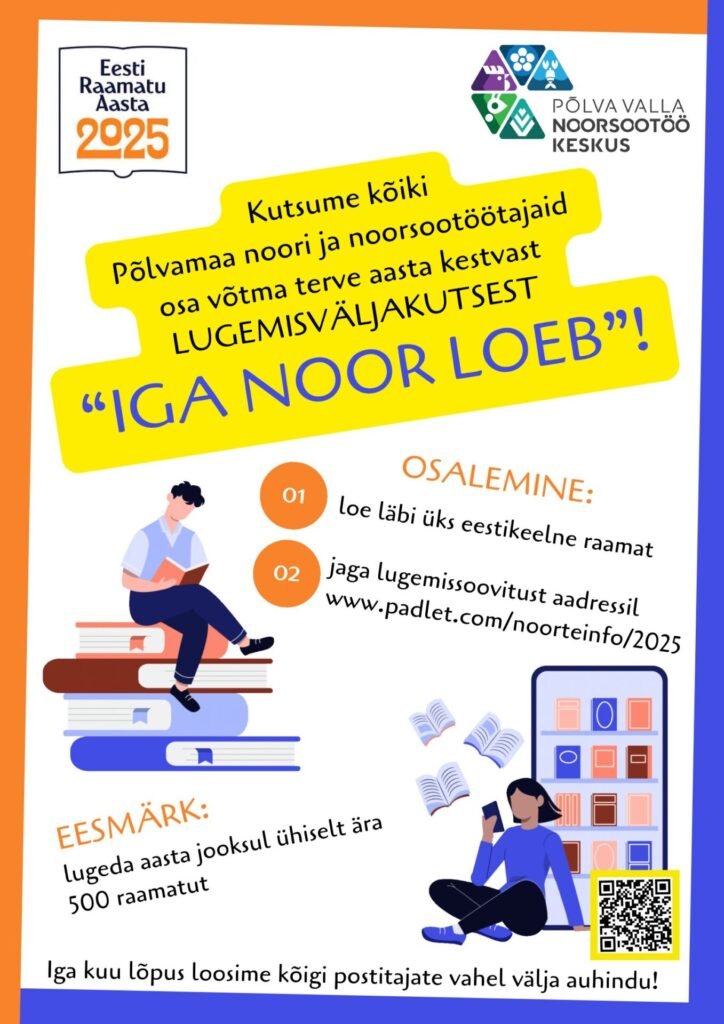 Eesti Raamatu Aasta 2025 raames toimub terve aasta kestev lugemisväljakutse “IGA NOOR LOEB!” – https://padlet.com/noorteinfo/2025.