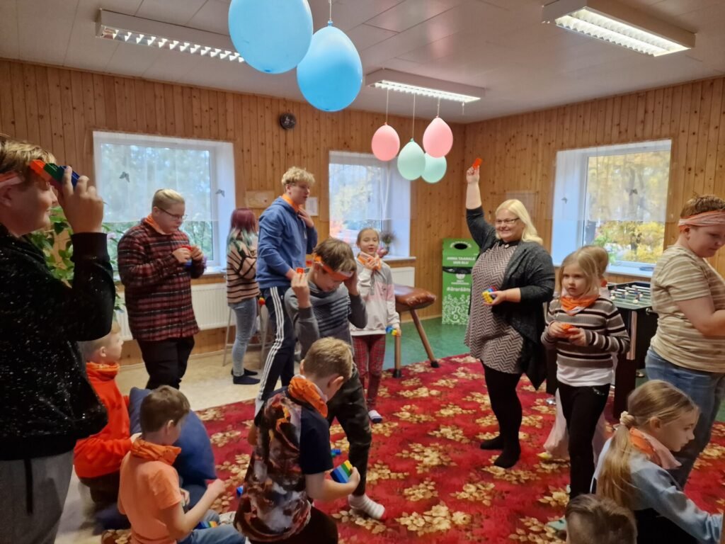 Kolmandaks panime proovile oma tasakaaluelundi. Meisterdasime klotsidest kuubiku ning liikusime koos sellega mööda tuba ringi. Alguses oli kuubik meil peas, seejärel kõhul ja siis seljal. Tuli välja, et noored on väga osavad ning füüsiliselt keerukaid ülesandeid täideti mängleva kergusega. Nalja sai palju!