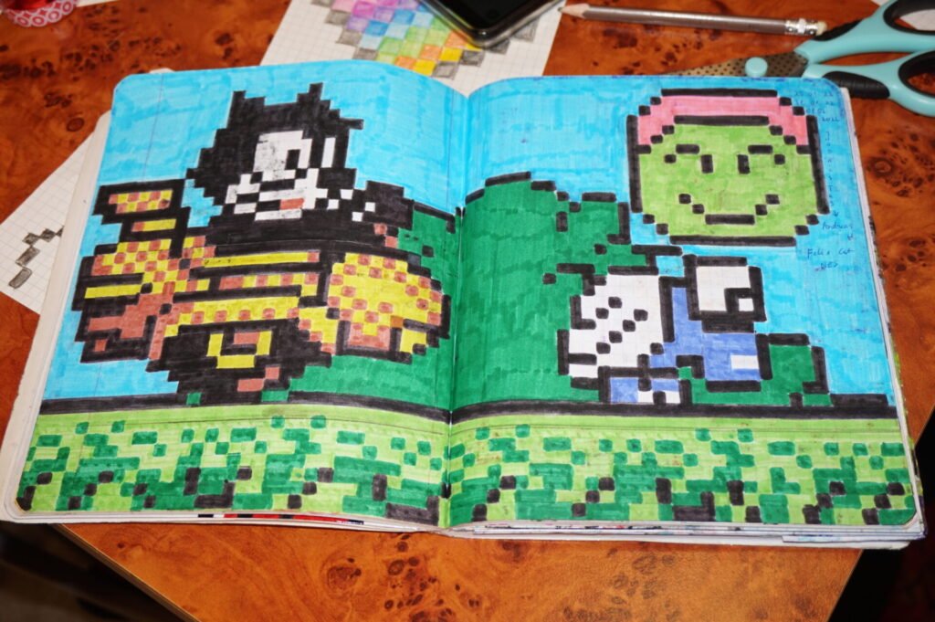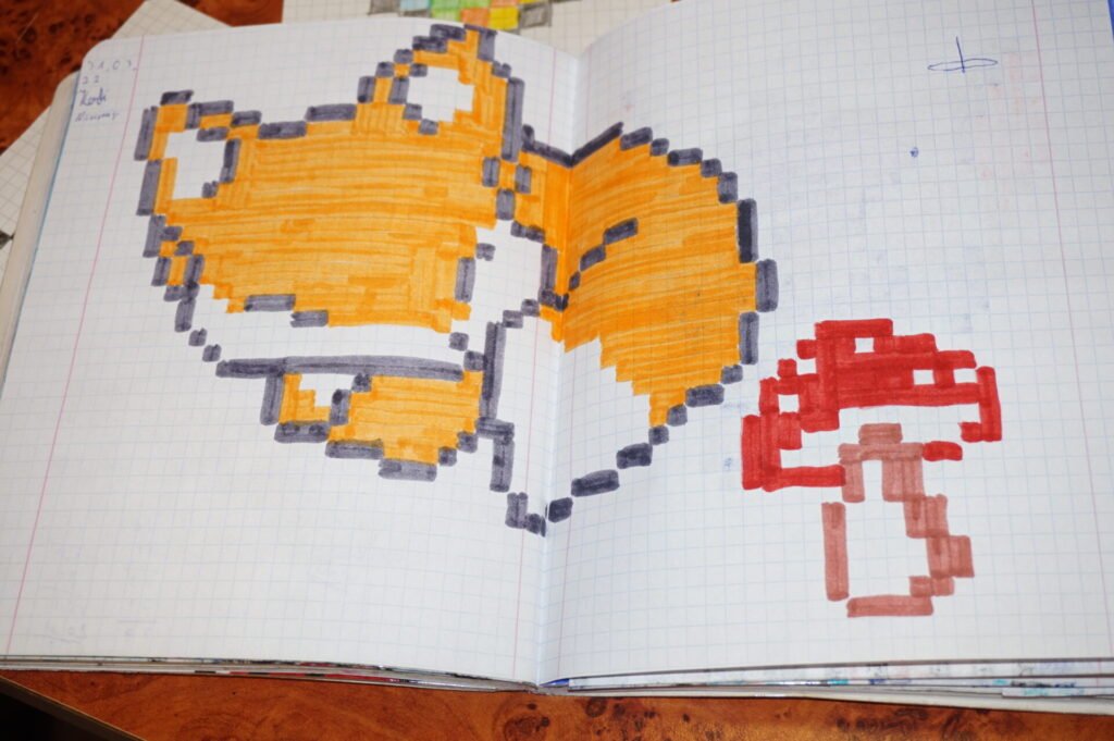 Kolmas ja viimane tegevus oli peale pingelist madistamist selline rahulik omaette nokitsemine. Noortel tuli ProgeTiigrile või Code Week programmeerimisnädalale valmistada 10 sünnipäeva puhul õnnitluskaart. Pikslikunsti näidised olid ees, kuid samas võis ka ise midagi põnevat välja mõelda. Siinkohal suured-suured tänud Andreasele, kes oma pikslijoonistustega kaustiku välja otsis ning seda meiega jagas. Kilkasin vaimustunult peaaegu iga kunstitöö peale, sest tean täpselt kui palju aega ning loovust sellise töö tegemine tegelikult nõuab. Nüüd on kõigil võimalik Andrease töödest inspiratsiooni ammutada. Pikslikunsti saab teha ükskõik mis teemadel (on selleks siis lemmikmängu kangelased või hoopis koomiksitegelased, vahet pole), peaasi et endale meeldib.
