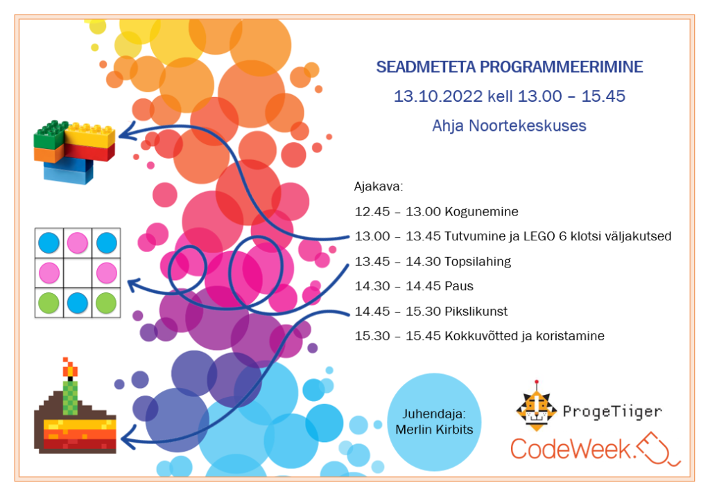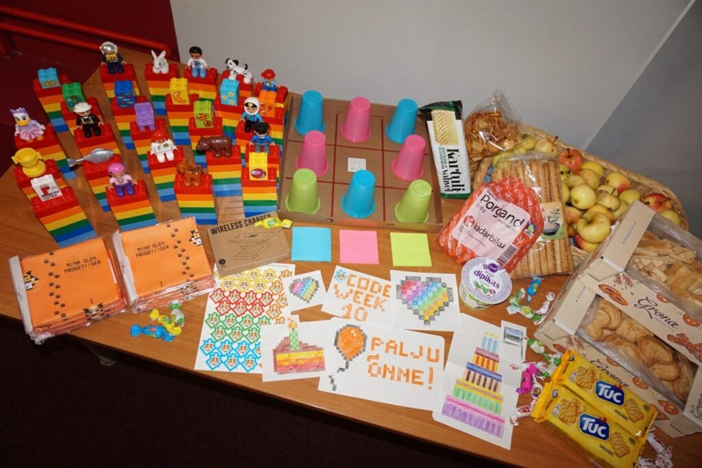 Peale topsilahingut võtsime käsile veidikene rahulikuma tegevuse ehk pikslikunsti. Noortel tuli ProgeTiigrile või Code Week programmeerimisnädalale valmistada 10 sünnipäeva puhul õnnitluskaart. Pikslikunsti näidised olid ees, kuid samas võis ka ise midagi põnevat välja mõelda. Rõõm oli joonistamise käigus kuulda, et Ahja Kooliski olid sellel päeval Code Week’i tegevused toimunud. Näiteks nutiringi raames tutvustati õpilastele virtuaalreaalsuse prille.