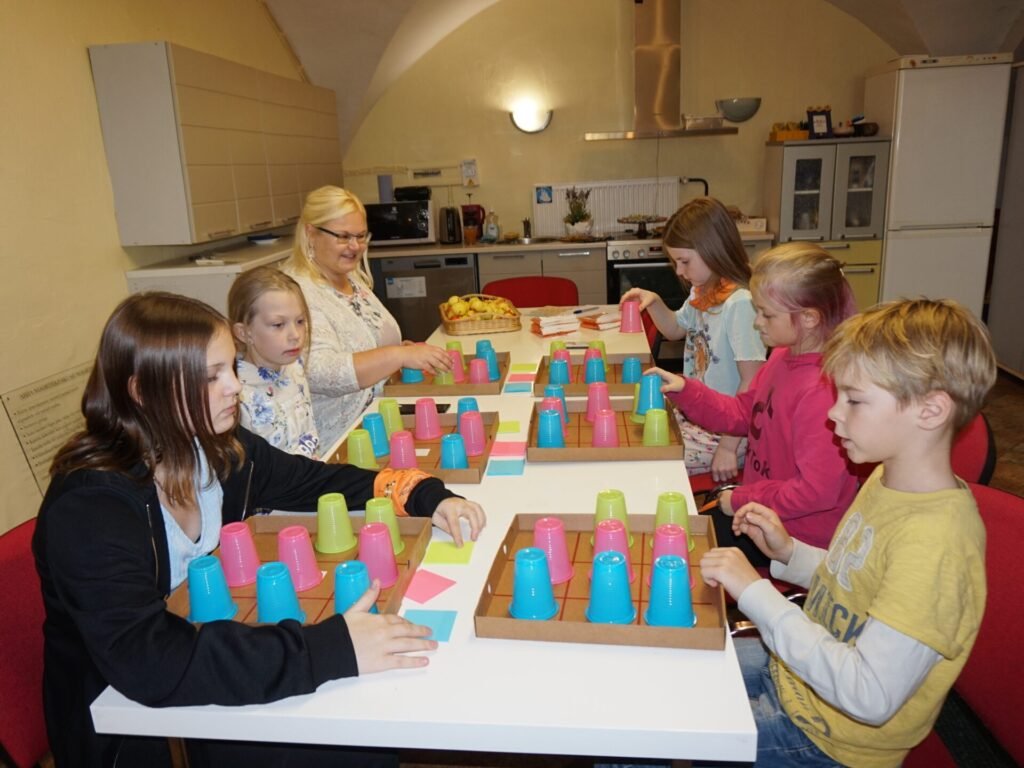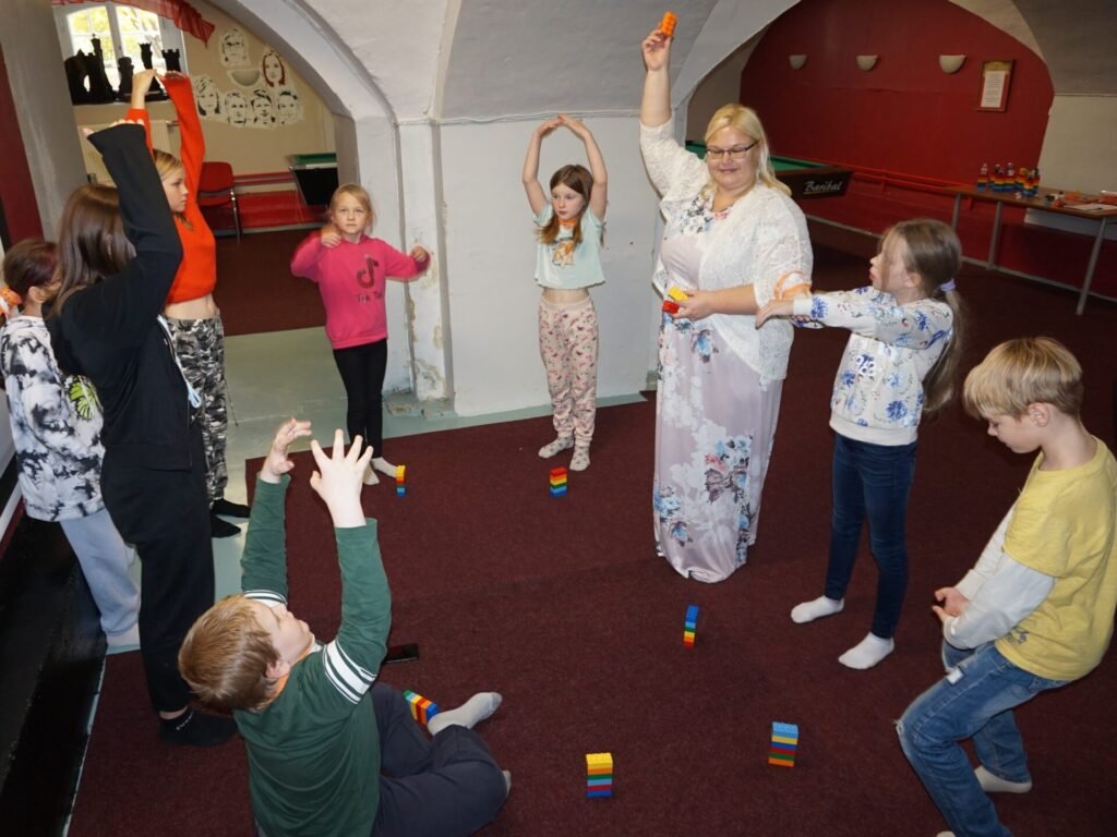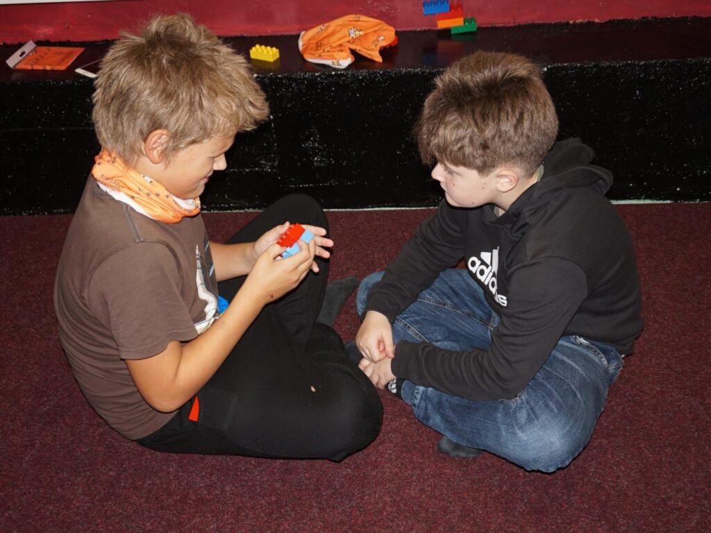 Seitsmendaks tuli valida endale paariline, lasta tal silmad kinni panna ning ehitada alguses 2 klotsist ja hiljem 3-4 klotsist midagi vahvat. Seejärel pidi paariline silmad kinni klotse katsudes ära arvama, mida ja kuidas on ehitatud ning oma klotsidest püüdma samasugust kujundit järgi ehitada. Kohe oli näha, et noorte koostööoskused on väga head, ülesanne lahendati ära mõnusa sumina saatel ning kiiresti.