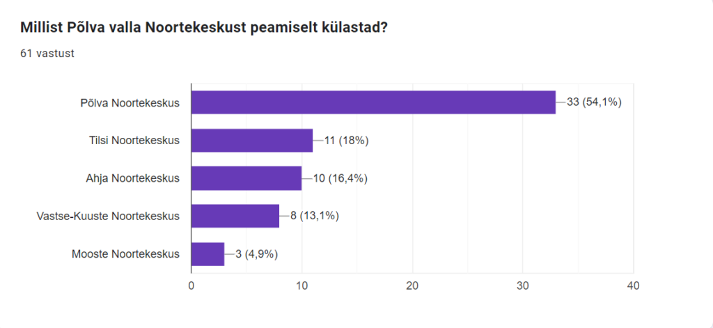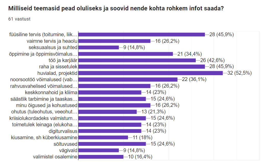 14.11.-14.12.2022 viis Põlva valla Noorsootöö Keskus läbi küsitluse, et selgitada välja, millised on noorte jaoks olulised teemad, milliseid infokanaleid noored kasutavad ja milliseid info saamise viise nad eelistavad. Küsitlusele vastas kokku 61 noort. Kõige aktiivsemad olid vastamisel Põlva Noortekeskuse noored (45,1% vastanutest) ja kõige rohkem vastajaid oli 11-13 aastaste noorte hulgas (45,9%).
