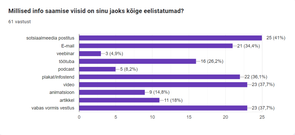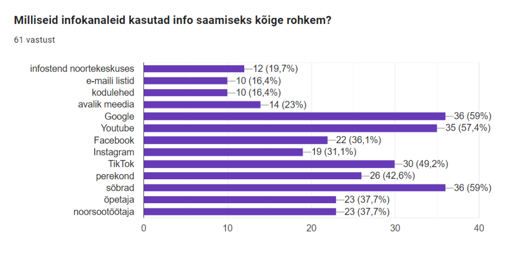 Kõige olulisema infoallikana toovad noored välja sõbrad (vastajate arv 36). Samuti kasutatakse info saamiseks Google otsingumootorit (36) ja YouTube keskkonda (35). Ankeedis toodud valikutele lisaks mainivad noored veel Wikipediat ja Snapchati. Info saamise viisidest on eelistatuimad sotsiaalmeedia postitused (vastajate arv 25), videod (23) ja vabas vormis vestlused (23). Lisaks ankeedis olnud valikutele mainitakse ära ka sõnumite saatmine/saamine ning kodulehekülgede külastamine.