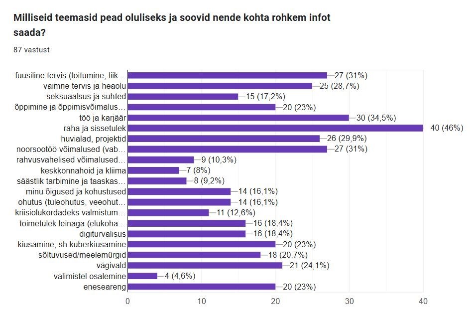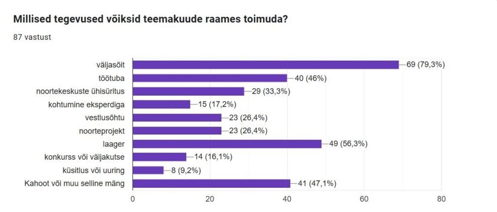 Ühtlasi soovisime selle aasta küsitluses saada teada, millised tegevused võiksid noorte arvates teemakuude raames toimuda. Kõige rohkem soovisid noored minna väljasõidule (vastajate arv 69) ja osaleda laagris (49). Lisaks tahtsid nad mängida Kahooti või muid viktoriinipõhiseid mänge (41), osaleda töötubades (40) ja noortekeskuste üritustel (29). Võrreldes 2024. aastaga pole nendes eelistustes midagi muutunud ning tegevuste järjestus on jäänud täpselt samaks. Lisaks etteantud vastustele mainisid noored, et nad soovivad korvpalli, näitlemismänge ja üleüldse mänge mängida, käija matkamas, tegeleda robootikaga ja teha meeskonnatööd.