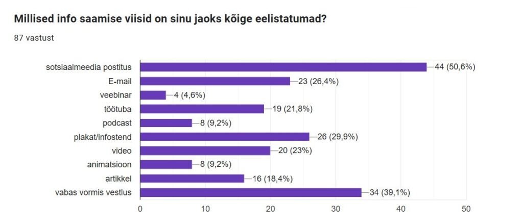 Info saamise viisidest on eelistatuimad sotsiaalmeedia postitused (vastajate arv 51), vabas vormis vestlused (34) ja plakat/infostend (26). Aastatel 2023 ja 2024 olid eelistatuimad sotsiaalmeedia postitused, videod ja vabas vormis vestlused. Kõige suurem muutus võrreldes varasemaga ongi toimunud video eelistamises. 2023. aastal eelistasid video vaatamist 37,7%, 2024. aastal 47,3% ja 2025. aastal 23% vastanutest. Lisaks ankeedis olnud valikutele toodi eelistusena välja ka vestlusõhtud.