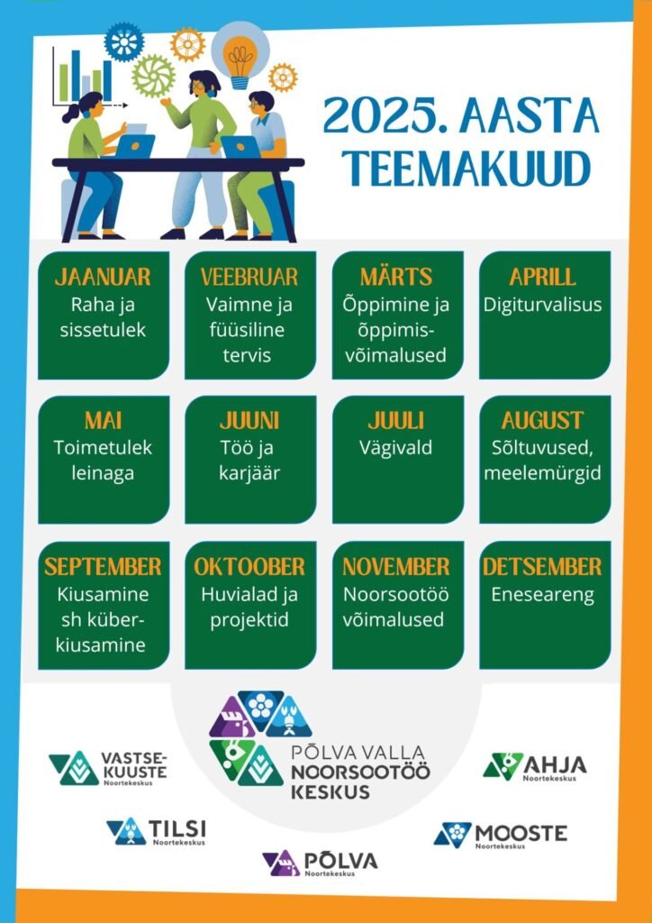 2025. aasta teemakuud on järgmised: raha ja sissetulek (vastajate arv 40), töö ja karjäär (30), noorsootöö võimalused (27), füüsiline tervis (27), huvialad ja projektid (26), vaimne tervis ja heaolu (25), vägivald (21), kiusamine sh küberkiusamine (20), õppimine- ja õppimisvõimalused (20), sõltuvused/meelemürgid (18), toimetulek leinaga (16) ja digiturvalisus (16). 2025. aastal otsustasime vaimse ja füüsilise tervise mahutada ühe teemakuu sisse, eks näis, kuidas see meil õnnestub. Võrreldes varasemaga on noorte jaoks märgatavalt tõusnud vägivalla teema olulisus. 2023. jaanuaris pidasid seda oluliseks 14,8%, 2024. aastal 11% ja 2025. aastal 24,1% vastanutest. Samas huvialade ja projektide olulisuse osakaal on jätkuvalt langustrendis – 2023. aasta jaanuaris oli see 52,5%, 2024. aastal 38,5% ja 2025. aastal 29,9%. Lisaks ankeedis etteantud vastustele nimetasid noored veel teemasid nagu muusika, film, näitlemine, mängimine, laager, aktiivne tegevus ja meekonnatöö, ettevaatlikus ohtlike olukordade suhtes ning kuidas leida sõpru.