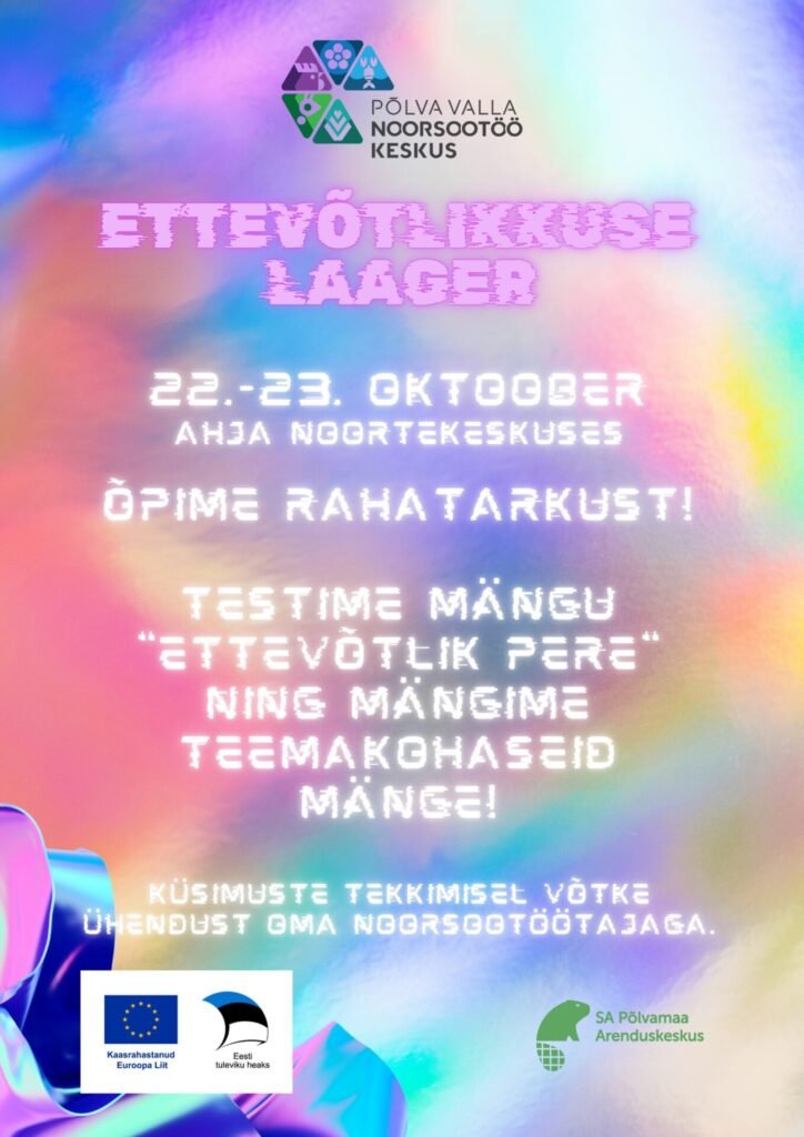 Põlva valla Noorsootöö Keskuse oktoobrikuu teema oli “Huvialad ja projektid” ning teemakuu raames toimus 22.-23.10.2024 Ahja Noortekeskuses ettevõtlikkuse laager. Laagri eesmärk oli toetada noorte huvi rahatarkuse valdkonna vastu ning piloteerida ettevõtlus- ja rahatarkuse õppeprogrammi “Ettevõtlik pere”. Laagris osales 30 noort erinevatest Põlva valla noortekeskustest ning 6 noorsootöötajat. Projekti rahastas “Lõuna- Eesti Ettevõtlikud Noored” (LEEN) programm.