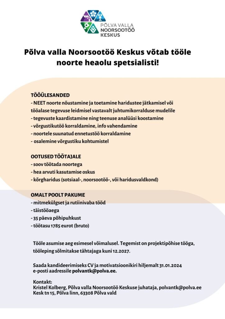 Põlva valla Noorsootöö Keskus võtab tööle noorte heaolu spetsialisti!