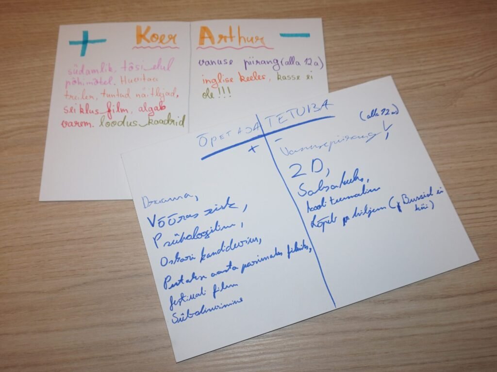 Noortele jäid silma kaks filmi: “Koer Arthur” ja “Õpetajate tuba”, mis mõlemad tundusid võrdväärselt huvitavad. Et otsuse langetamist lihtsustada, panid noored kirja mõlema filmi plussid ja miinused. Peale mõningast arutelu langetasid noored valiku “Koer Arthuri” kasuks.