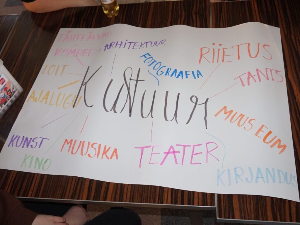 Esimesel Kultuuriklubi kohtumisel kaardistasime me esmalt enda jaoks kultuuri mõiste. Mõiste kirjapanekul olid abiks nii varasemad koolitunnis omandatud teadmised kui ka Google’i otsingumootor. Seejärel panime kirja lemmik Eesti filmid, näitlejad, muusikud, kirjanikud, muuseumid ja rahvustoidud. Suurimaks väljakutseks oli näitlejate nimede meenutamine. Kõige sujuvamalt läks muusikute kirjapanek, kuid samas üllatas, et mõni noor ei tarbi üldse Eesti muusikat, vaid eelistab hoopis välismaist.