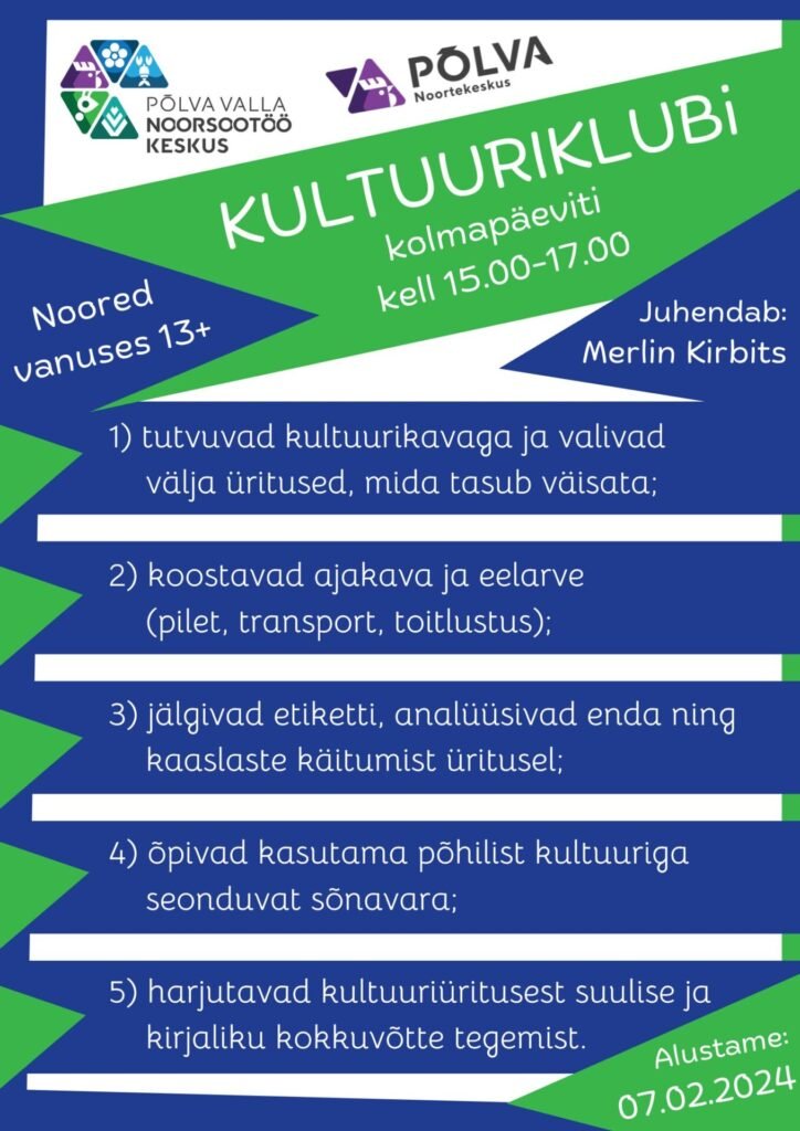 Järgmine Kultuuriklubi toimub 21.02.2024 kell 15.00-17.00 Põlva Noortekeskuses noorsootöötajate ruumis.