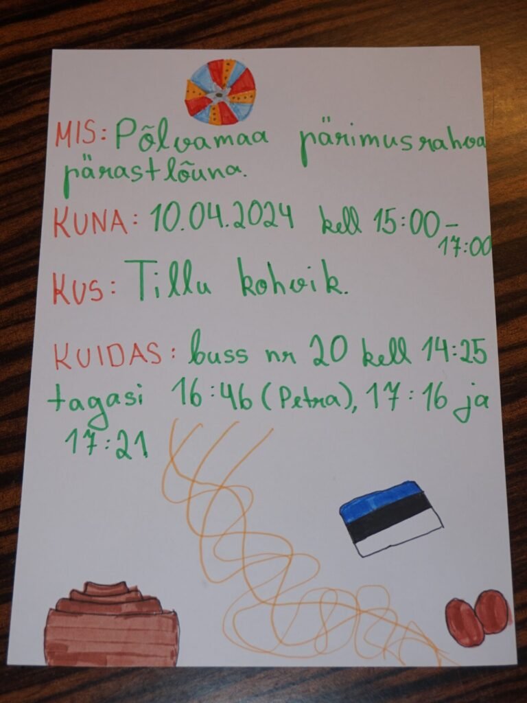 10.04.2024 kell 15.00-17.00 Põlvamaa pärimusrahva pärastlõuna Tillu kohvikus;