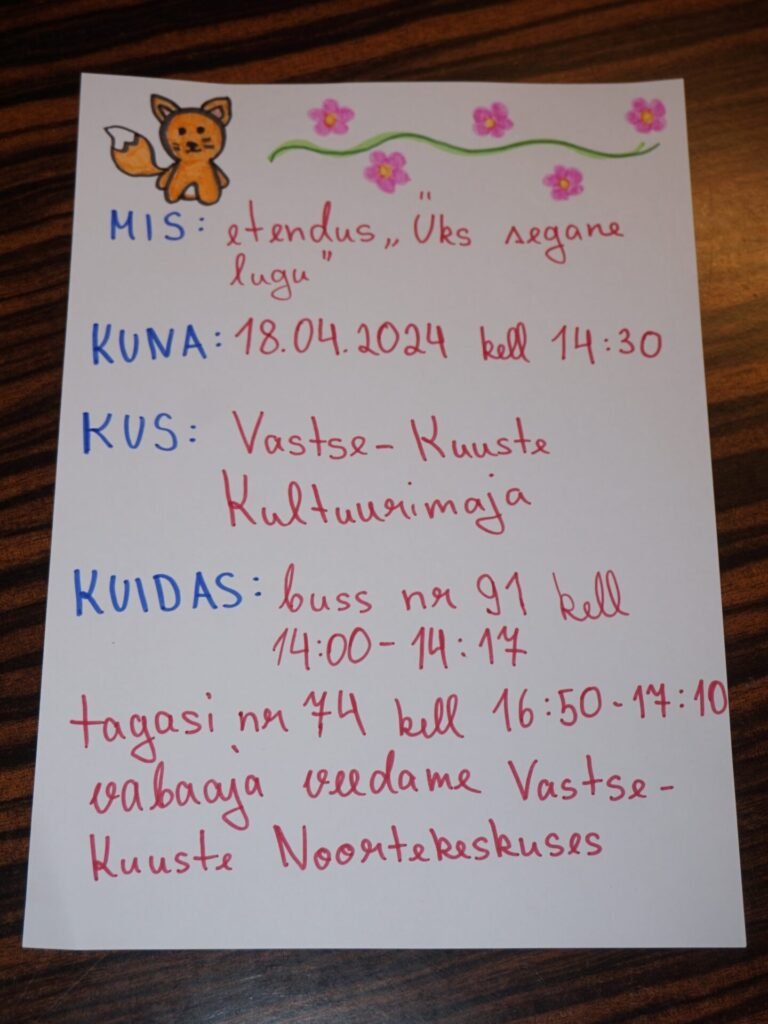 18.04.2024 kell 14.30-15.10 etendus “Üks segane lugu” Vastse-Kuuste Kultuurimajas (kus astub lavale ka Vastse-Kuuste Noortekeskuse noorsootöötaja Alina Vals);