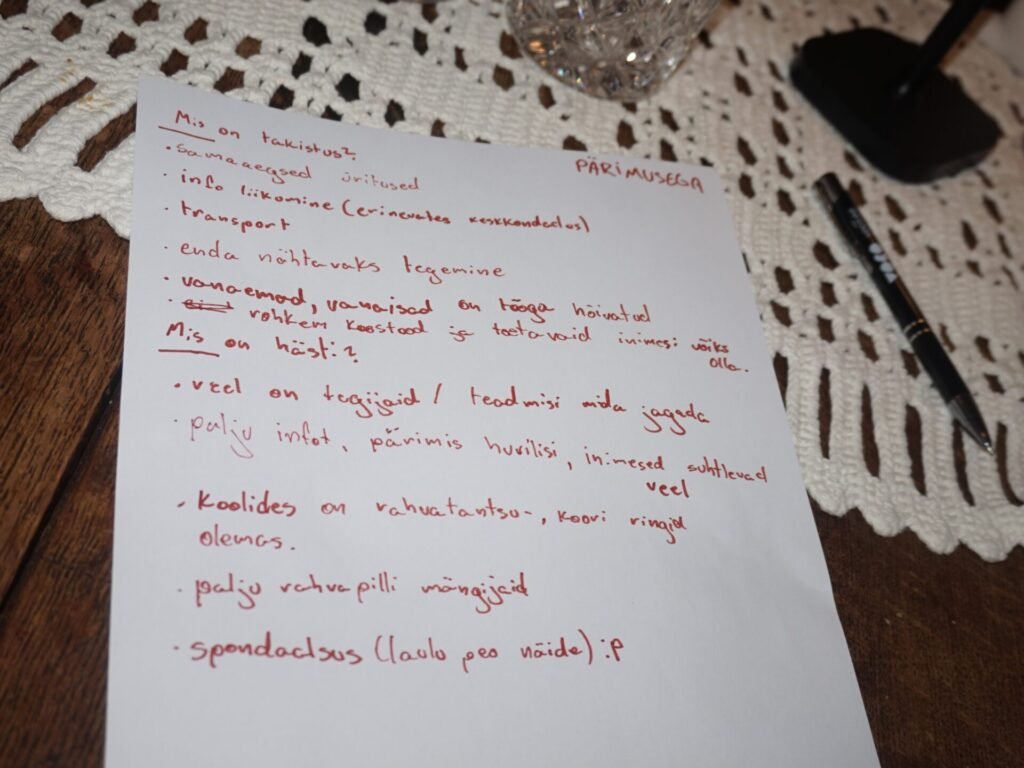 Peale seda arutlesime laudkondades selle üle, mis on Põlvamaal pärimusega hästi ning mis takistab sellega tegelemist. Meie laudkonnas sai märkmete tegemise ja ettekandmise rolli endale Petra. Tore oli jälgida, et nii mitmedki osalejad noogutasid kokkuvõtet kuulates kaasa ning jagasid meie laudkonnas tekkinud mõtteid. Viimaks avaldas igaüks arvamust, kas ja kui sageli võiks edaspidi kohtuda ning mis võiks olla kohtumise sisu. Ühtlasi mõtisklesime selle üle, kuidas igaüks meist saab panustada (kasvõi toolide tassimisega). Kokkuvõtvalt võib öelda, et kultuuriklubil veetis sisuka ja hariva õhtupooliku. Rõõm on tõdeda, et enamus noori oli seda meelt, et sellistel kohtumistel võiksime me ka edaspidi osaleda. Suur-suur aitäh Eesti Folkloorinõukogule, et nad sellise toreda ja vajaliku ürituse korraldasid ning jääme ootama järgmist kutset.