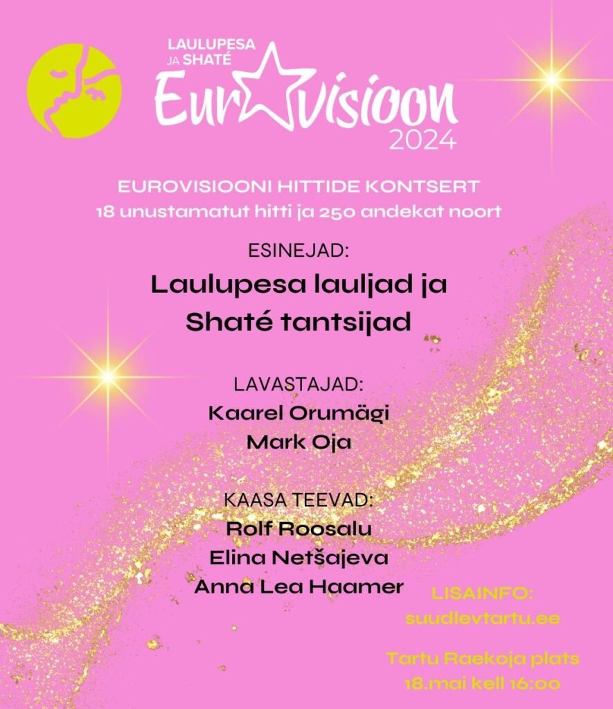 🏆 18.05.2024 kell 16.00-17.45 Laulupesa ja Shaté “Eurovisioon 2024” Tartu Raekoja platsil;
