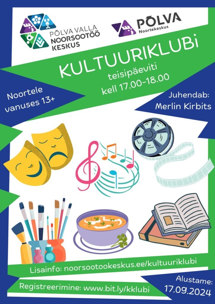 Järgmine kultuuriklubi toimub 03.04.2024 kell 15.00-16.00 Põlva Noortekeskuses.