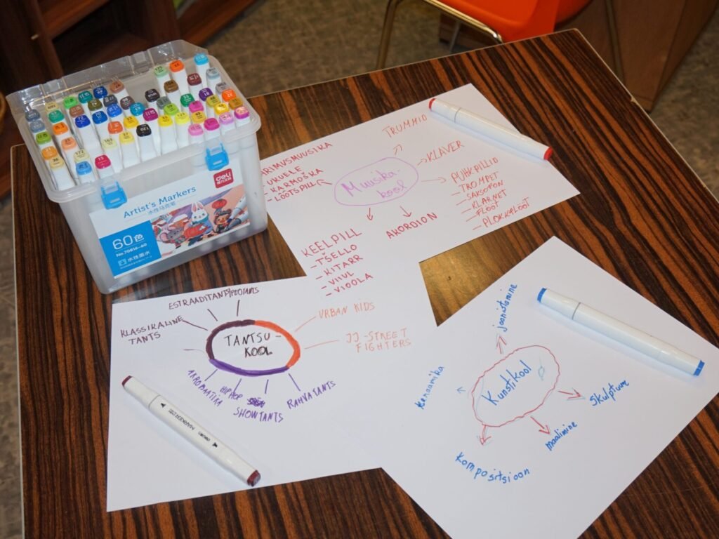 Kultuuriklubi kolmandal kohtumisel arutlesime kultuurivaldkonnaga seotud õppimise võimaluste üle Põlva linnas. Kultuuriklubilistel tuli otsida informatsiooni ning koostada mõistekaarte selle kohta, mis erialasid saab ühes või teises huvikoolis õppida. Selgus, et sellise info otsimine ja leidmine polegi nii lihtne, kui esmapilgul arvata võiks.