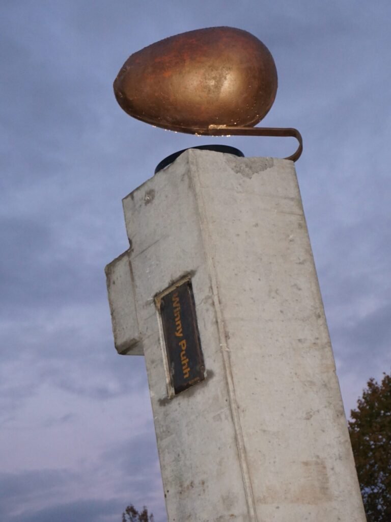 Peale Põlva Kunstikooli külastust tegime väikese peatuse ka munamendi ehk Winny Puhhi verivärske ausamba juures. Tore on mõelda, et see maailmakuulus bänd just Põlvast on alguse saanud. Nad on ehe näide sellest, et hea tahtmise juures on kõik võimalik – ka iseendale 30-ndaks juubeliks ausamba püsitamine! Nüüd jääb üle vaid oodata, millal munast vägev kukk koorub.