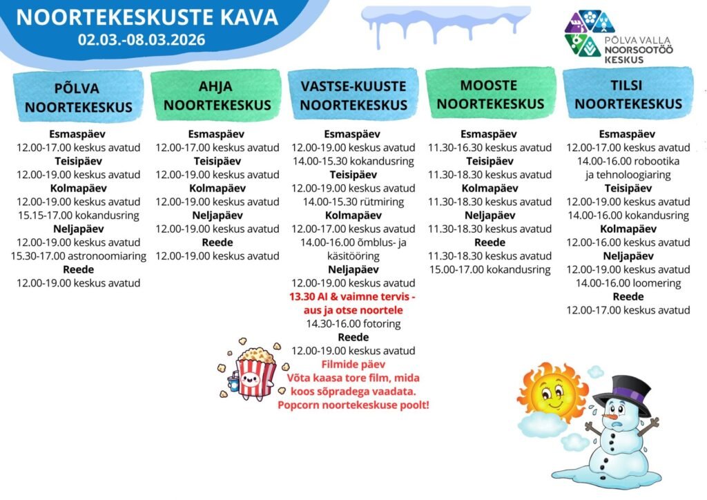 Noortekeskuste kava 02.03.-08.03.2026