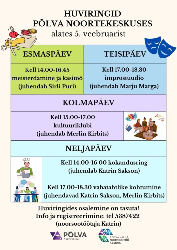 Alates 05. veebruarist 2024. alustavad Põlva Noortekeskuses uued ja põnevad huviringid ja tegevused. Registreeri end esimesel võimalusel!