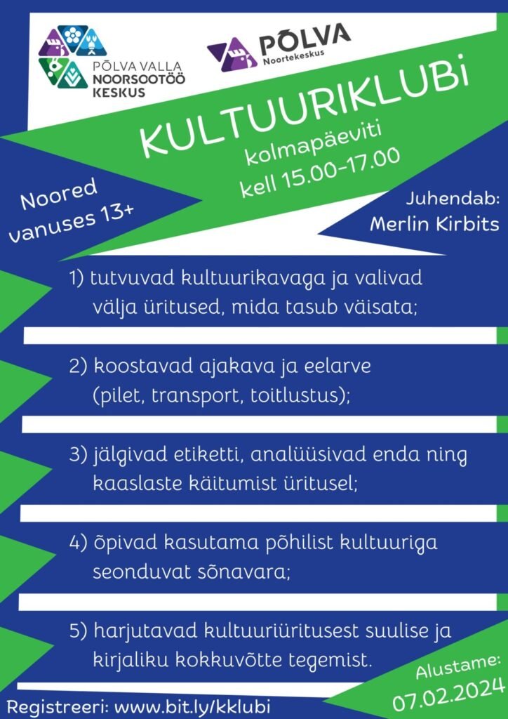 Kultuuriklubi: www.bit.ly/kklubi (tähtaeg 06.02.2024)