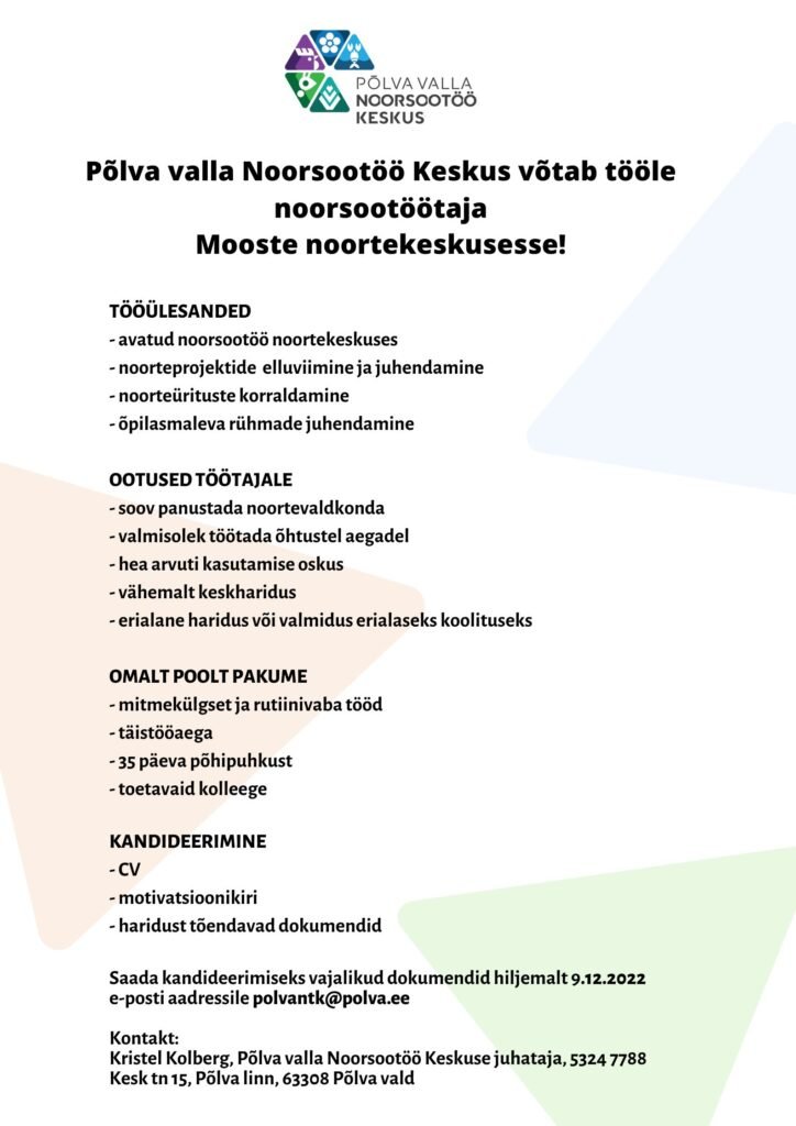 Põlva valla Noorsootöö Keskus võtab tööle noorsootöötaja Mooste noortekeskusesse!