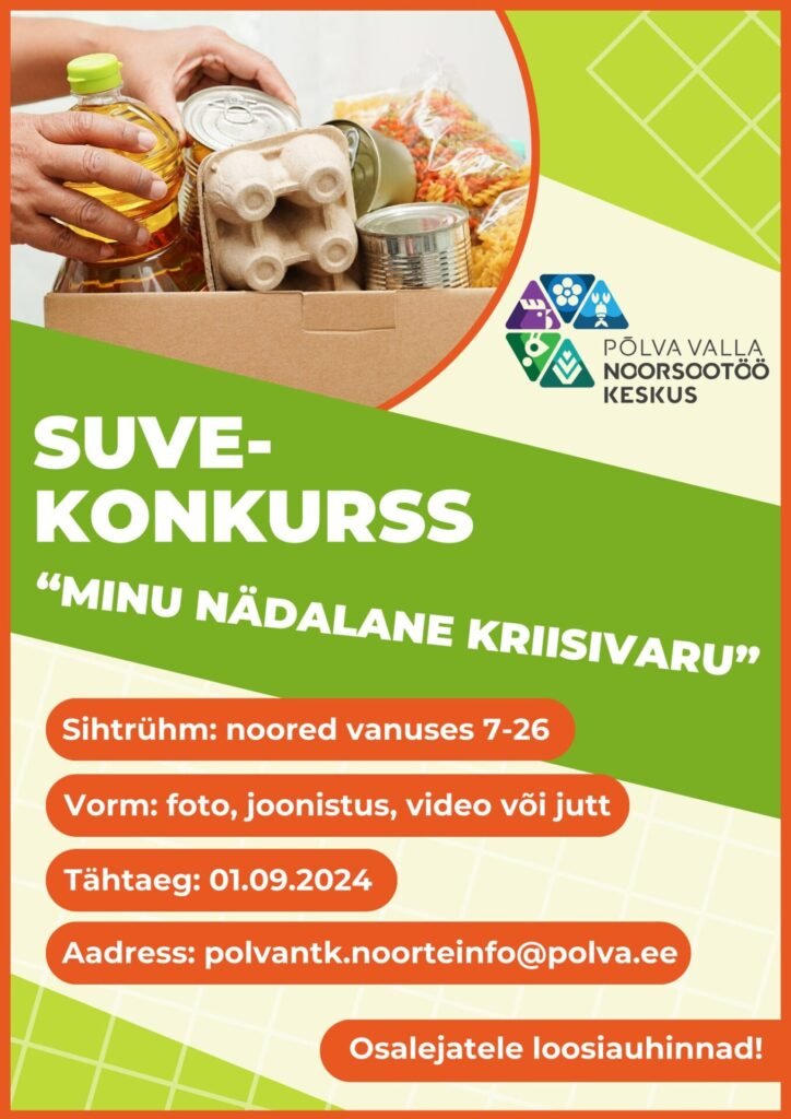 Hei, noor! Kas teadsid, et Põlva valla Noorsootöö keskuse juulikuu teema on “Kriisiolukordadeks valmistumine”? Teemakuu raames kuulutame välja toreda suvekonkursi “Minu nädalane kriisivaru”. Erinevas vormingus töid ootame kuni 01.09.2024 aadressile polvantk.noorteinfo@polva.ee. Esitada võib ka rohkem kui ühe töö!